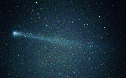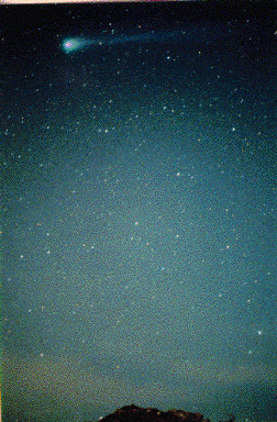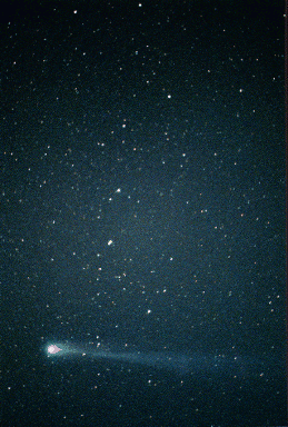 Photographed at Flat Rock, Newfoundland with 3200 ISO Konica colour print film, 35mm SLR + 50mm lens, 30 second exposure at f/1.8. All of these photos taken at ~9PM NST, March 24, 1996 (within hours of the comet's closest approach to earth) during a very lucky break in the rainy weekend weather. The clouds rolled back two hours later... |