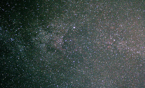 NGC7000 (North American Nebula) and nebulosities around gamma-Cyg (NGC 6910/6913), in Cygnus. (For omparison, check *here* ). The stock Canon EOS 350D is quite sensitive, but not to H-alpha. (120s exposure, 55mm lens, homemade poncet platform at Butterpot Park gate, Nov 18, 2006) Click on image for full resolution version. |