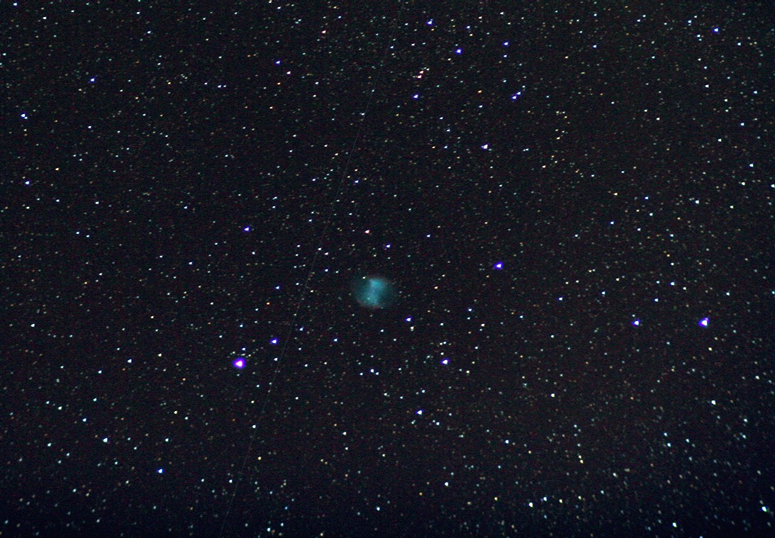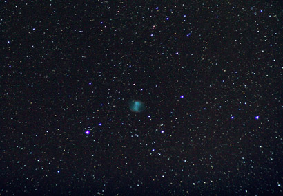 M27 "Dumbell Nebula" and starfield, in Vulpecula photographed from east-end St. John's May 17, 2007 by Chris Stevenson, using Canon EOS 350D digital SLR and Nexstar 80GT scope, on a homemade poncet platform.