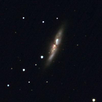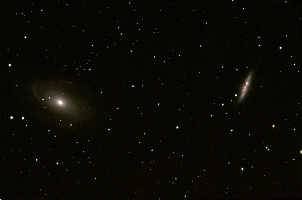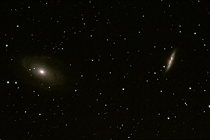 Galaxies M81 & M82 both in the constellation Ursa Major were imaged here with a 80mm ED refractor scope and a Canon 350d SLR camera. 67 30 second images were combined using Deep Sky Stacker. M 82 also known as the Cigar Galaxy is undergoing a sort of explosion at it's core region. The images were taken at the dark skies of Butterpot Park, Newfoundland on May 30, 2008 by Tim Crauk.
