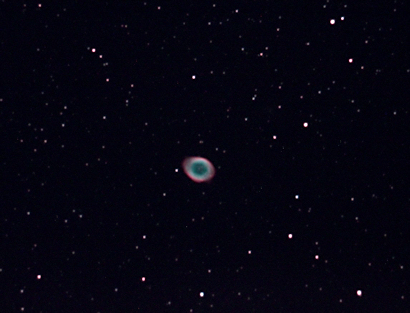 Image of "M57", Ring Planetary Nebula in Lyra. Three 30s exposures, photographed from St. John's on April 15, 2012 by Chris Stevenson. Click on image for full original photo. |