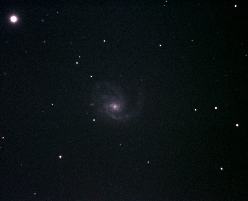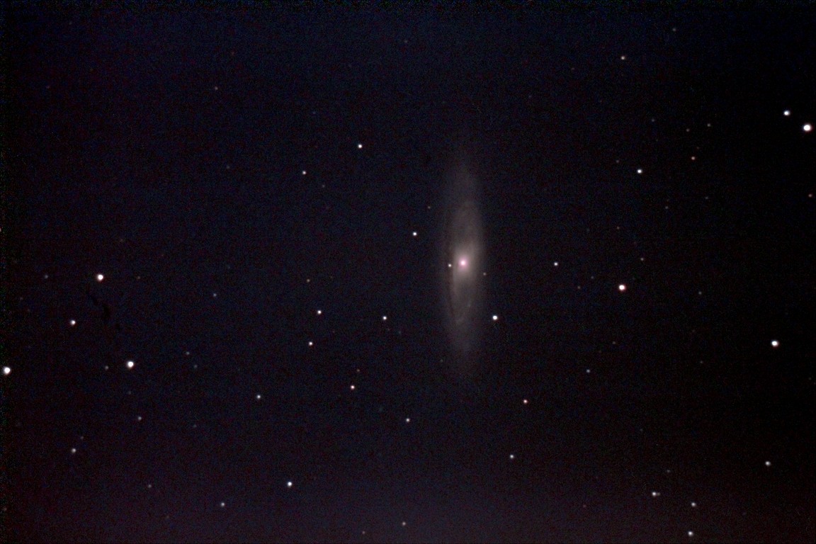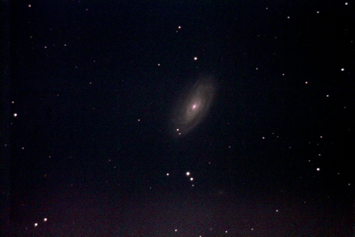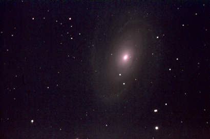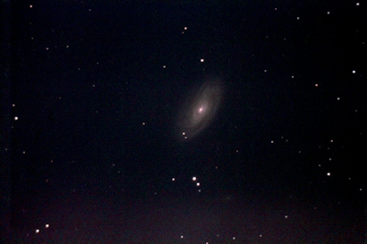 Image of "M81", in Ursa Major. The telescope was peering into the glare of a high-pressure sodium streetlamp for these exposures, taken at the end of the night. Seventeen 30s exposures, photographed from St. John's on April 15, 2012 by Chris Stevenson. Click on image for full original photo. |