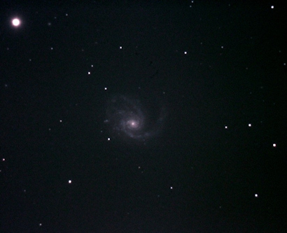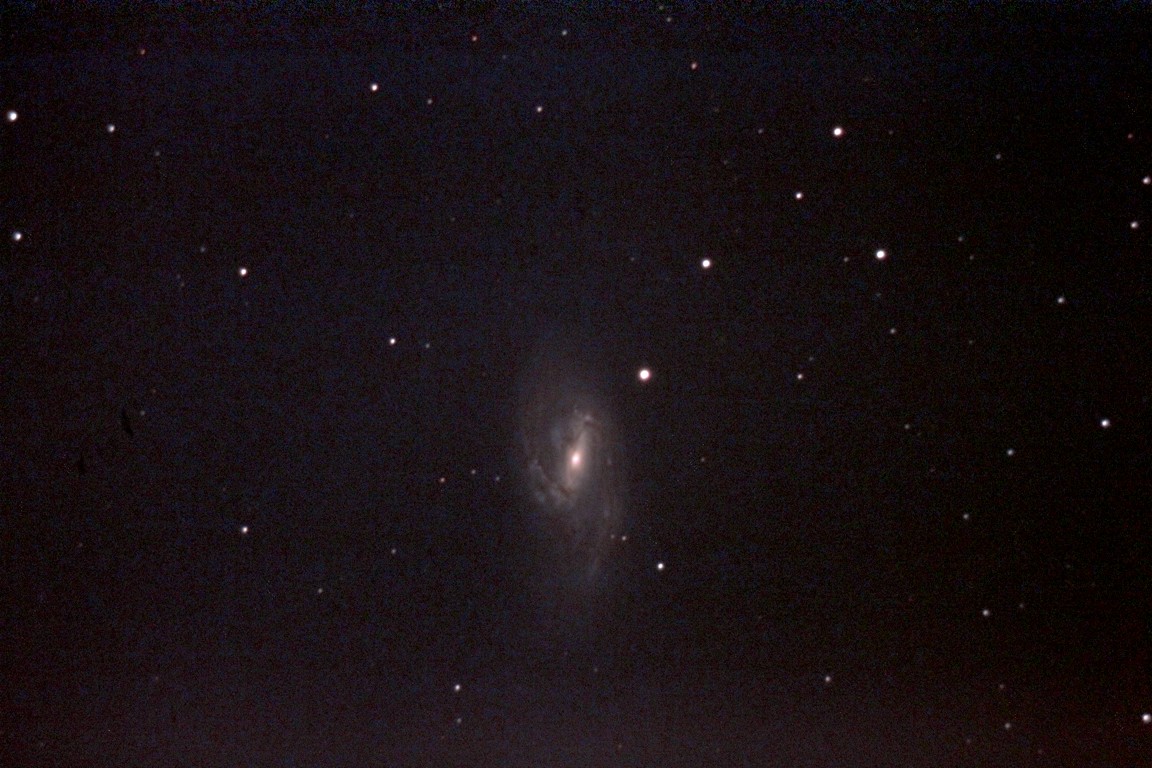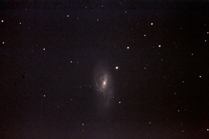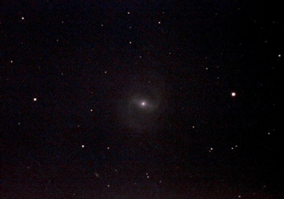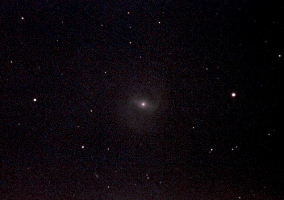 Image of "M91", also in southern Coma Berenices, a barred ring galaxy that is also the faintest in Charles Messier's catalog (V mag = 10.2). Only 14 30s exposures (not enough to do it justice). More info is here. The faint smudge bottom, left of centre, is PGC 41978, photographed from St. John's on April 15, 2012 by Chris Stevenson. Click on image for full original photo. |