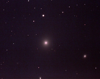 Image of "M87", with near-luminal velocity central jet visible. Also below and to right in this image is not-so-supergiant elliptical NGC 4478. (Several of the "dots" here are actually galaxies, all part of the Virgo Cluster), photographed from St. John's on April 15, 2012 by Chris Stevenson. Click on image for full original photo. |