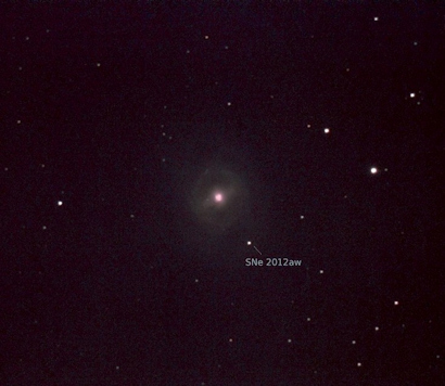 Image of "M95", with recent (now fading) supernova SNe2012aw, indicated. Sum of 26 separate 30s exposures, photographed from St. John's on April 15, 2012 by Chris Stevenson. Click on image for full original photo. |