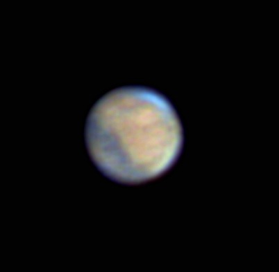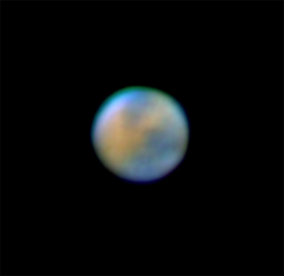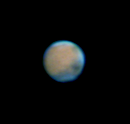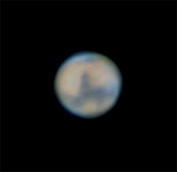 This shot of Mars was taken from St. John's on Dec 22, 2007 by Tim Caruk. Mars came closest to Earth in late Dec 2007. The diameter of the planet currently appears quite small at about 15 arc seconds in diameter and must be observed at 300 to 400 times with a telescope. The images were made with an 8 inch Celestron and a 4X barlow connected with a Neximager. About 300 video frames were combined with Registax to average out atmospheric turbulance. The polar caps as well as thin clouds can be seen along with major surface markings. |