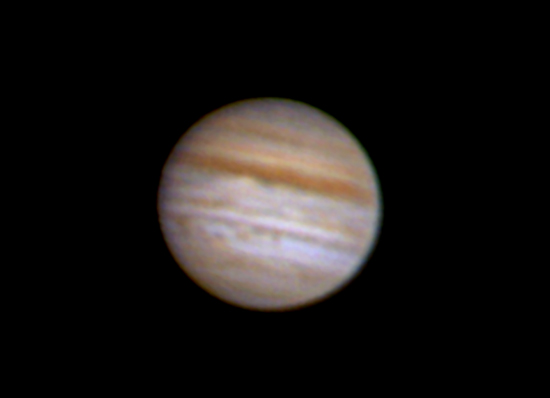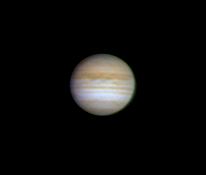 This shot of Jupiter was taken from St. John's on August 15, 2007 by Tim Caruk. It was taken with a Celestron 8 inch scope, using a Neximager. 375 images were processed with Registax. Since Jupiter is very low on the horizon atmopheric dispersion was corrected optically to increase visible detail.