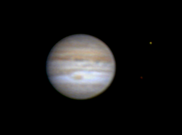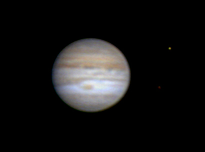 This image of Jupiter showing the great red spot storm and two of the Galilean moons, was taken from St. John's on August 19, 2007 by Tim Caruk. Registax was used to combine 209 images that were taken with a Celestron 8" scope and a Neximager.