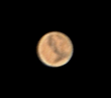 This shot of Mars was taken at St. John's, ~3 A.M., 05 Nov 2005, 20cm Meade LX-200 w/ QuickCam 3000 Pro (lenless), 2X barlow, and Toshiba Satellite M40X-RH4 notebook). Approx. 450 frames recorded at 30fps, 320x240, combined in RegiStax3 freeware). Visible in stacked image to left is Syrtis Major and Iapigia below Hellas, Syrtis Minor, Mare Tyrrhenum, Mare Cimmerium (R to L) | |