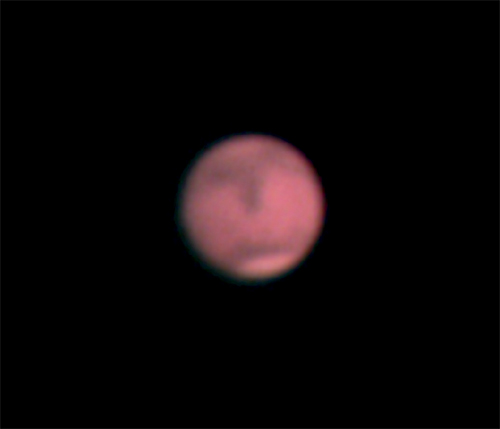 This image of Mars was taken on Jan 6, 2010 using a Celestron 8 inch SCT and a Meade DSI imager from Gary's backyard observatory. The diameter of Mars is currently only about 13 arc seconds. The large polar cap is currently melting and decreasing in size.