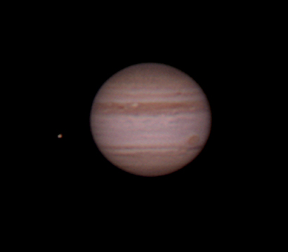 This is how Jupiter appeared on Sept 16, 2010 from my backyard. The planet's Great red spot storm can be seen near the edge at the lower right. The lower equatorial Dark cloud region this year has been covered by high altitude white clouds making it disappear. I took the image with a Canon A 540 camera attached to a 8in Meade SCT by combining about 900 images with Registax.
