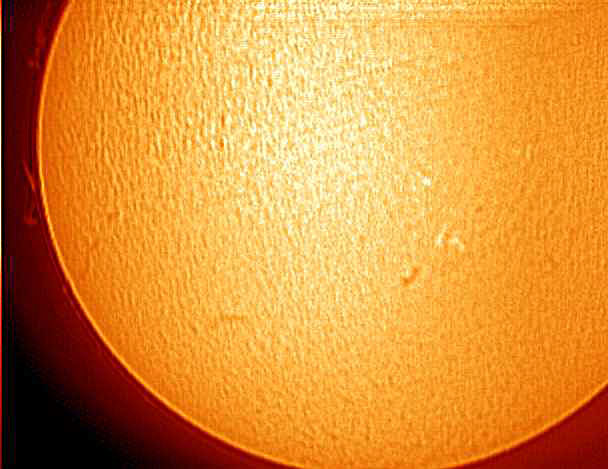 The Sun as photographed with the Centre's Coronado 40mm H-alpha PST, w/ QuickCam 3000 Pro webcam (lenless) connected to a Toshiba Satellite M40X-RH4 notebook Note the small prominences on the left. Not bad for "zero" sunspot number at solar minimum! Approximately 450 frames were recorded at 30fps, 320x240, and combined in RegiStax3 freeware Photographed on February 19, 2006 at ~11 A.M.